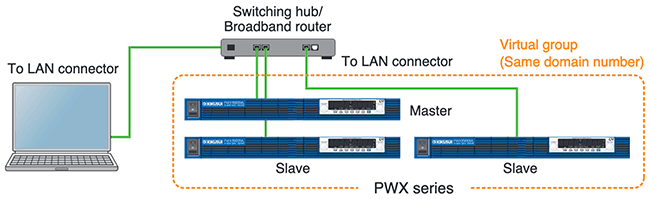 As shown in the figure below, it is possible to connect a PC and the PWX series with a hub to create a virtual group using a LAN connection. A maximum of 255 virtual groups can be set, and the maximum number of units can be configured up to 31 units per group. A group can have a mixture of models.